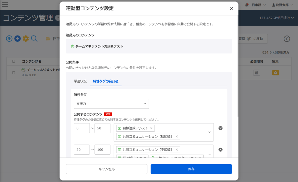 例えば、全社共通で実施するコンプライアンス診断の結果をもとに、理解度が低い分野(例:「情報セキュリティ」「ハラスメント防止」など)の補強教材を自動的に提示したいというものです。